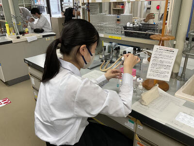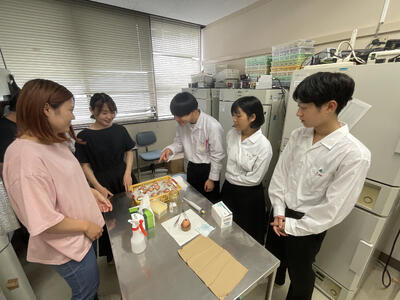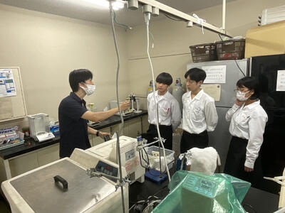 最後は、生物生産コース研究室を見学しました。宇都研究室の「腫瘍移植鶏卵を用いたガンの創薬研究」では、鶏卵を用いることで、スピーディーで多種類の研究ができる手法について説明をしていただきました。実際に鶏卵にがん細胞を移植する操作を体験させていただきました。創薬研究が薬学部以外でもできることに驚きました。後藤研究室の「生物のもつ優れた環境適応性の解明〜生体膜の機能解明を目指して〜」では、高圧力下での細胞の変化や、その機能を解明する研究が行われていました。圧力が生物環境にどのような変化をもたらすのかについてわかりやすく講義していただいた後、研究室での実験風景を見学させていただきました。