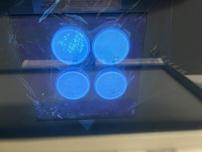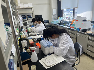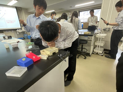 大学の充実した設備・施設を使いながら、遺伝子組換えの基礎知識や実験を行いました。実際にクラゲの蛍光タンパク質であるGFPを作りだす遺伝子を大腸菌に組み込む実験を行い、実験の楽しさや繊細さを身にしみて感じたようです。