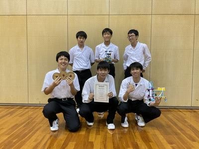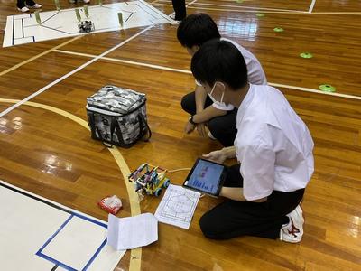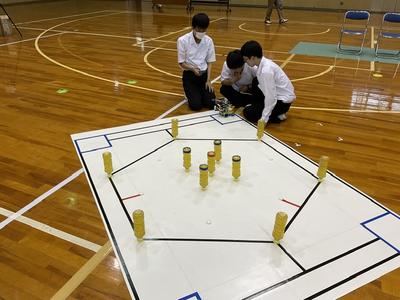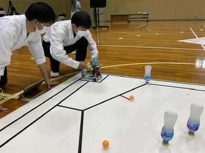 試合結果ですが、1年次生チームは、初戦を突破し2回戦進出を果たしました。2年次生チームは、決勝戦まで順調に勝ち進みました。決勝戦では、序盤にミスが出ましたが、最高得点を獲得するよう瞬間的にプログラムの選択したり、再スタート時にロボットの設置位置調整やタイヤの微調整を行い、3分間最善を尽くし見事優勝を勝ち取りました。