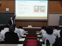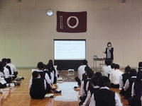代表2年次生は,テーマを選んだきっかけや工夫した点,現在でも迷いがあるところや今後の展望についての,ありのままを話してくれました。これからテーマを設定し,グループを決定していく1年次生にとって大変参考になる内容でした。1年次生も熱心に話を聞き,メモをとったり質問をしたりしていました。質問に先輩方も懇切丁寧に答えてくださり,いい刺激が得られたと思います。