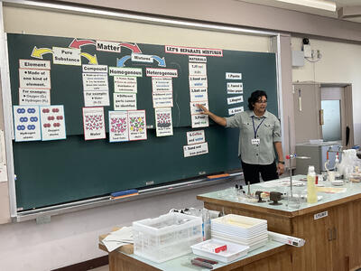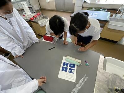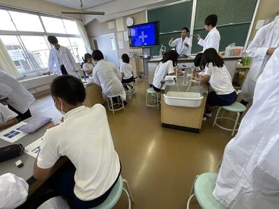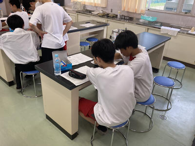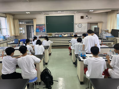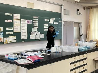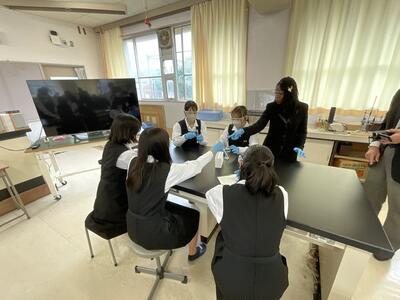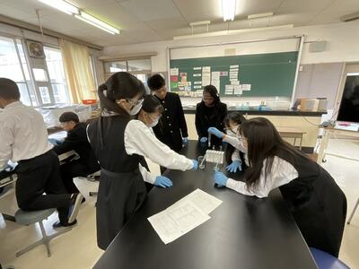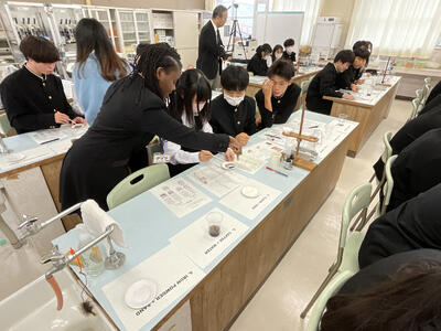 鳴門教育大学大学院の研究員による英語で理科授業を本年度も行いました。昨年度より、普通科2年次理系の生徒にも実施しています。2限目は普通科、4限5限は理数科生徒を対象にオールイングリッシュでの理科実験授業を実施しました。SAGAR Meenal Yashna:フィジー(主授業者)、SHI Weina:中国、LI Ying:中国(補助授業者)各先生による「混合物と分離」を2・5限目に、JAMO Deila:モザンビーク(主授業者)、BANZE Alaudino:モザンビーク(補助授業者)各先生による「食物の分類(含有タンパク質検出)」を2・4限目に実施しました。実験やグループワーク及びディスカッションを行い、事前に配付された単語リストを活用し、コミュニケーション力をフルに発揮して授業に挑みました。