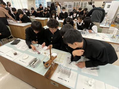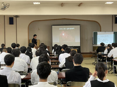 大阪大学との高大連携事業を2部制で実施しました。第1部(6限)は、1・2年次生を対象に実施しました。惑星科学分野の研究について講義していただきました。太陽系がどのように形成されたのかについて、最新の研究結果を交えてわかりやすく説明していただきました。太陽系の惑星の形成について今まで信じられてきた「京都モデル」の矛盾点について、観測事実に基づき丁寧に解説していただきました。太陽系や生命誕生の謎を解き明かすために、隕石や微惑星の岩石中にある鉱物のもつ情報が必要であることも知ることができました。また、小惑星「りゅうぐう」から見事にサンプルリターンを成功させた「はやぶさ2」の「サンプルホーン」の開発には、久好先生が関わられた科学部の研究手法が利用されているそうです。