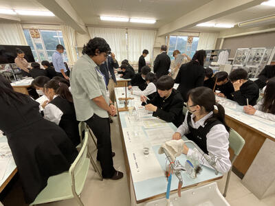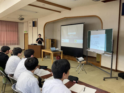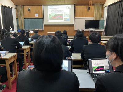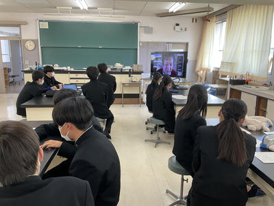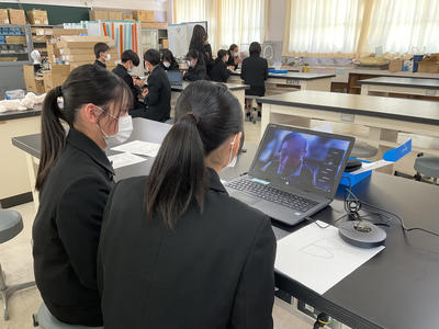 生徒の感想:今回の講義を受講し、「よい研究には結果が予想しやすいものが多いということがとても意外でした。」「身近なところから研究テーマを見つける方法が分かってよかった。」「仮説を立てる大切さを改めて理解しました。同時に、私たちの仮説も見直してみようと思いました。」などの前向きな感想が多くありました。自分たちの課題研究が、よりよい研究となり新しい成果になるような研究を目標に頑張ります。