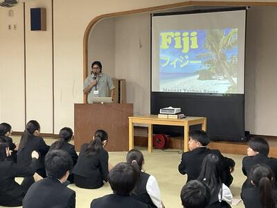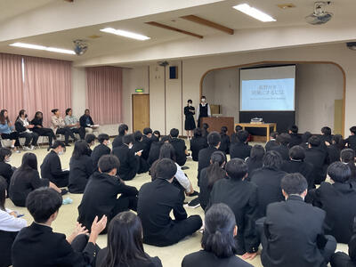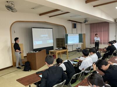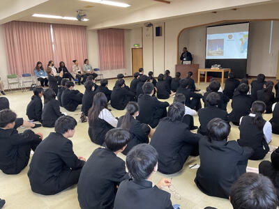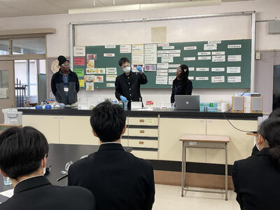 交流会では、研修員の出身国の紹介を英語でプレゼンしていただいた後、理数科2年次生が課題研究のアブストラクトを1分程度で発表しました。生徒は、科学的な内容を英語で理解するという貴重な体験により、語学を学ぶ意識が高まったようです。