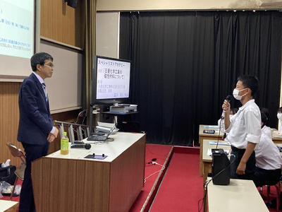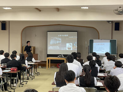講義内容:理数科2年次生を対象とした特別講義を実施しました。「テーマ」、「リサーチクエスチョン(問い)」、「仮説」の3点セットをしっかりと設定することで、誰もが見聞きしたことのある身近な現象でも、よい研究となり、新しい成果になることがわかりました。また、テーマ探しのヒントを先生の経験をもとに具体的に説明してくださいました。