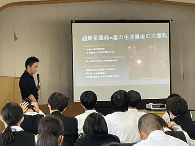 宇宙に存在する元素が、どのように合成されてきたかについて、1.ビッグバンによる合成過程、2.恒星の内部での合成過程、3.鉄よりも重い元素の合成過程について、図や動画をもとにわかりやすく説明していただきました。現在研究中の超新星爆発による元素合成の過程についての説明や、世界初の観測に成功したお話などは、生徒の興味・関心が最も高いものでした。