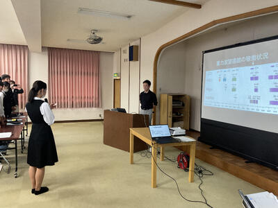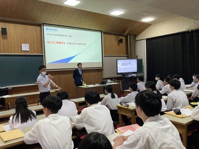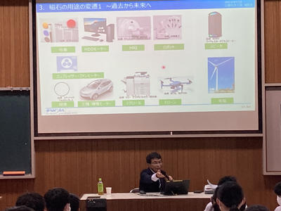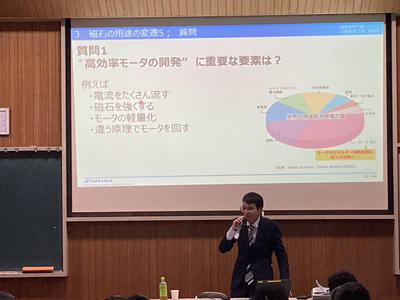 初めに、日亜化学工業の会社紹介があり、自社で製造・開発中の希土類を原料とした磁性体についてわかりやすく説明をしていただきました。特に強力な磁石の開発には、磁性材料の生成技術が欠かせないことなど、専門的な知識について多くのことを学びました。最後に研究者として、将来の進路選択等に生かせる貴重なアドバイスをいただきました。