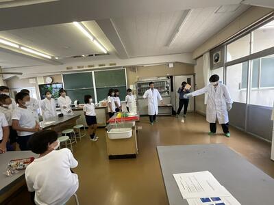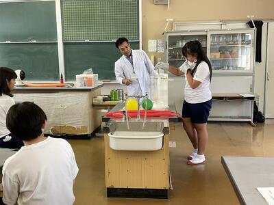 理数科2年次生11名が、阿南市横見小学校の6年生13名を対象に理科実験教室を実施しました。まず初めに、液体窒素によるサイエンスショーを行いました。