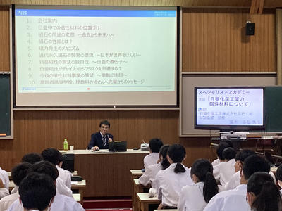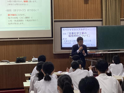 理数科1・2年次生を対象とした講演を実施しました。冨本先生は、「省エネに貢献する 日亜化学の磁性材料」と題して、①会社紹介、②近代永久磁石の開発の歴史と磁力発生のメカニズム、③日亜磁性の製法の独自性、④今後の磁性材料事業の展望について、順を追って話をしてくださいました。