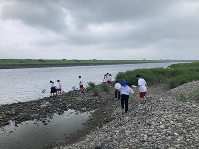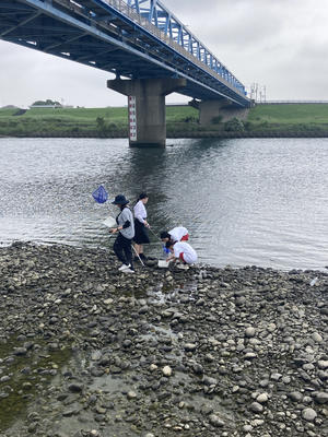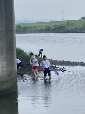 昨年度と同じ場所(大京原橋中央付近)で、理数科1年次生がSS1フィールドワーク(那賀川水質調査)に取り組みました。今回は、水量が多かったため、昨年度よりも浅い場所での調査になりました。那賀川の調査に関しては、徳島県危機管理環境部環境管理課水質担当者の御指導のもと、安全に行うことができました。パックテスト用に表層の水を採取し、網を使って小魚・エビ・サワガニ等を採集しました。また、川底の石を裏返し、ピンセットで摘んだり、スポイトで水をかけてバットに落として水生生物を採集しました。水質階級を知る手掛かりとなる指標生物であるヒラタカゲロウ等の採集を目標にして調査を行いました。