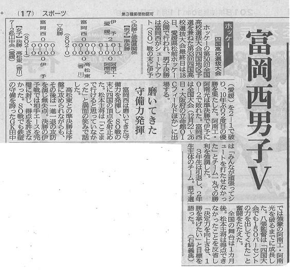3年前に部員1名となったチームでしたが、現2年生の加入で息を吹き返し、10年ぶりに県内での勝利を収めました。現大会名(徳島県高校選抜ホッケー大会)では初優勝、全国高校選抜徳島県予選としては10年ぶり5回目の優勝となりました。当日は大勢の保護者の皆様、 OBG の熱い応援をいただき本当にありがとうございました。 11月17,18日愛媛県で行われる四国高校選抜ホッケー大会では全国大会出場にむけ、「心ひとつに目指せゴール」で頑張ります。