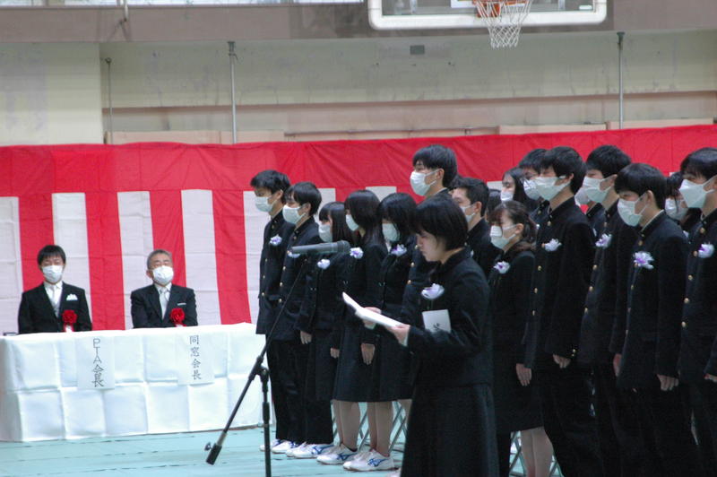 担任の先生から一人ひとりの名前が呼ばれた後,普通科・理数科それぞれの総代に卒業証書が手渡され,210名が卒業しました。新型コロナウイルス感染の拡大防止のため,様々な制限がある中での高校生活でしたが,生徒たちは仲間との絆や笑い合ったかけがえのない時間,今まで見守ってくださった方々への感謝など,高校3年間で得た大切な宝物を胸に,笑顔で思い出多き学び舎を巣立っていきました。