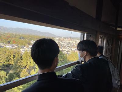 松江観光では各自昼食をとった後、堀川遊覧で船に乗って松江城に行きました。天守閣まで登ると、松江の町を一望できました。