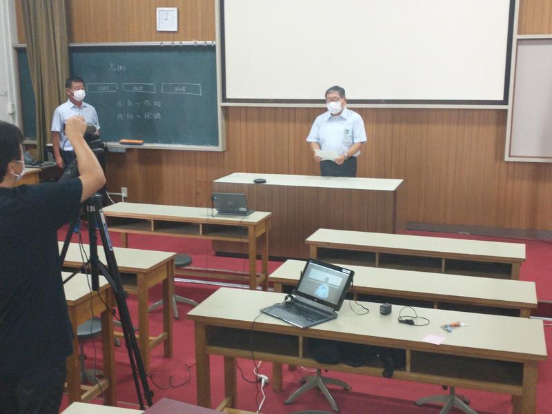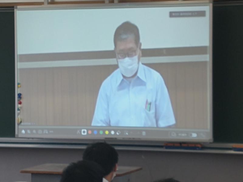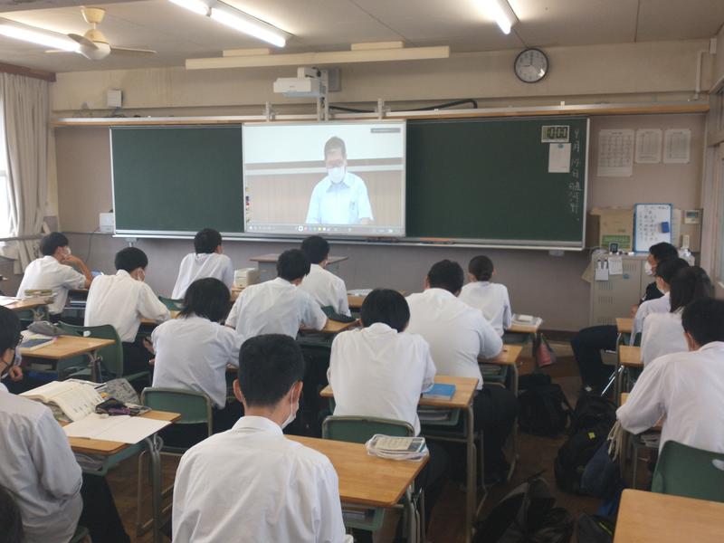 全年次の登校が開始された9月14日,表彰伝達・始業式をZoomと電子黒板により実施しました。視聴覚教室より中継し,各教室で視聴しました。今回は,映像については外部デジタルビデオカメラから取り込み,音声は会議用集音マイクを使用することにより各教室へ臨場感のある映像と音声を配信することができました。