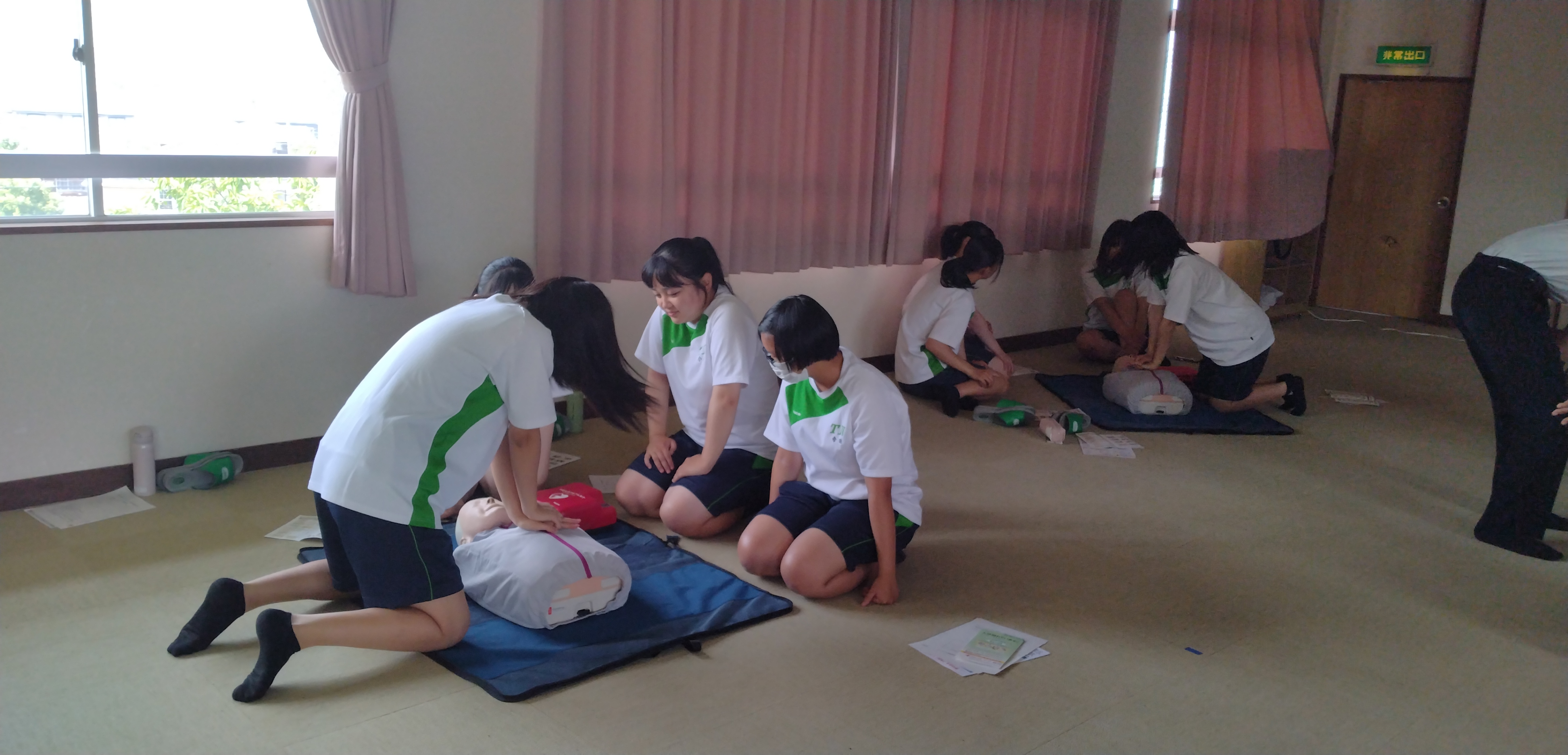 当日はJRC部員と体育部の部員、教員が総勢49名参加し、①心肺蘇生とAEDの使い方②気道異物除去③熱中症についてを学びました。10体の蘇生人形と10台のAEDトレーナーを使い、実践さながらの講習でした。